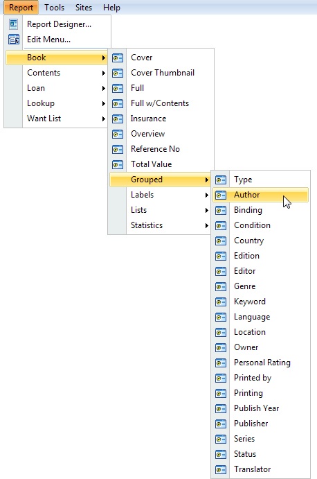 BookCAT comes with many pre-defined reports. These reports are available from the Report menu.