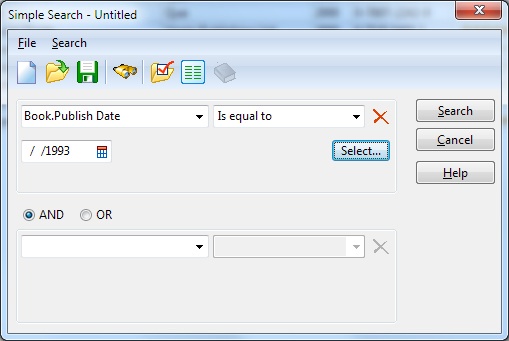 The simple search lets you define a search criteria based on one or two fields. You specify field, operator and the value you want to search for. The search criteria can be saved to a file for later use.
