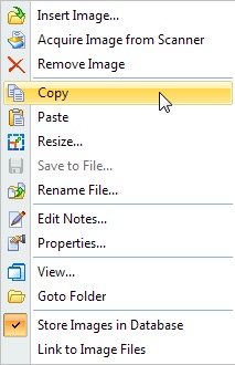You can either store images in the database, or link to external image files. Linking to external image files will keep the size of the database down, and give better performance. You can change this setting from the Options window (Tools=>Options=>Multimedia), or by right-clicking the image field in the data entry window and selecting from the popup menu ("Store Images in Database" or "Link to Image Files"). To "extract" images stored in the database and save them as external files, click 'Extract images' in the 'Database Maintenance' window. To load external images and store them in the database, click 'Load external images' in the 'Database Maintenance' window.