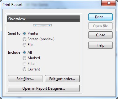 When you want to print out data, you can bring up the Report Designer to create a new report, select a pre-defined report from the Report menu, or use the Print List command to print the contents of the browse list.