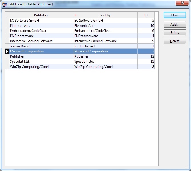 You can edit lookup tables from both the Lookup View, and the 'Edit Lookup Table' window. To open this window, right-click a data field linked to a lookup table (for example Publisher), and choose Edit Lookup Table from the popup menu.
