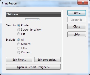 On the Report menu you also find all the pre-defined reports that ships with SoftCAT. Simply select the report you want to print. This will open the 'Print Report' window.
