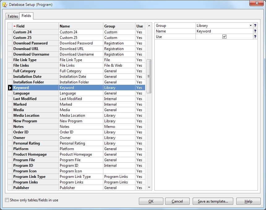 When you want to modify a field, it is important that you select the correct table before you activate the Fields tab. For example, to modify the Keyword field in the Program table, first select the Program table on the Tables tab, then click the Fields tab to display the fields in the Program table and locate the Keyword field.