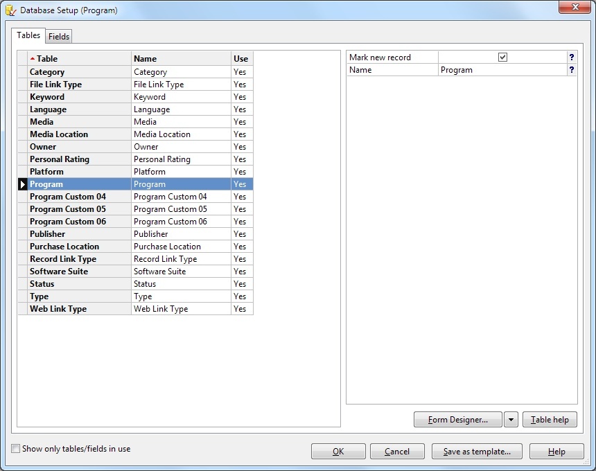 To open the 'Database Setup' window, choose Database Setup from the Tools menu. The main part of this window is occupied by a tab control with two tabs: Tables and Fields.